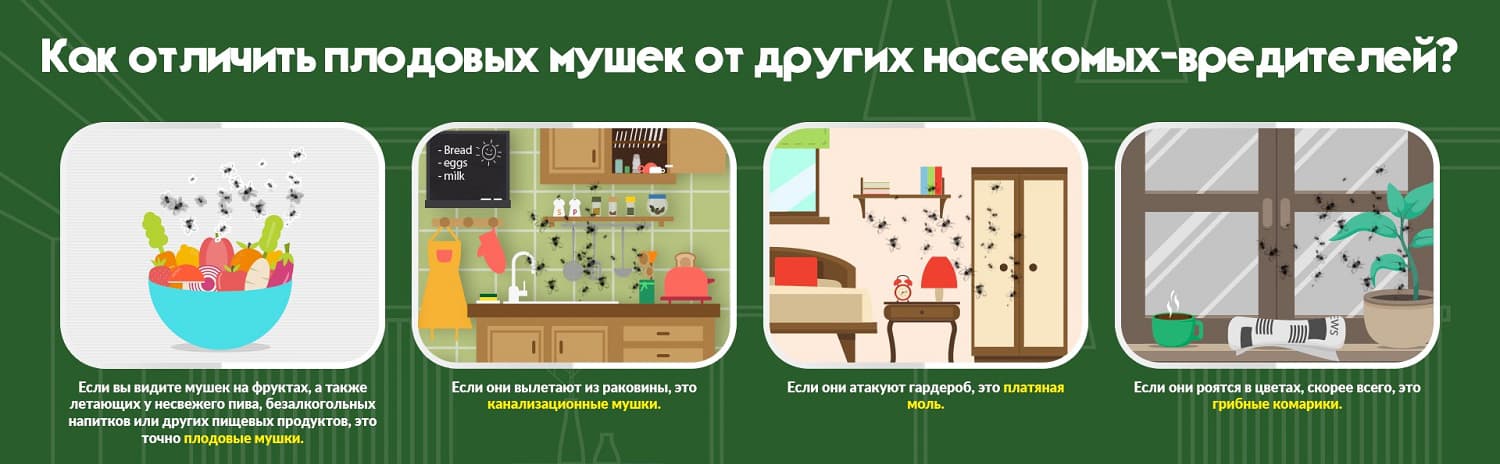 Même la maison la plus propre n’est pas à l’abri d’une infection par les mouches des fruits. Les mouches apparaissent à partir des œufs pondus par les insectes adultes sur les fruits alors qu'ils sont encore en train de mûrir. Ensuite, les fruits sont cueillis, apportés dans la maison et stockés, en oubliant de les laver. Il y a maintenant suffisamment de chaleur pour que le processus de pourriture commence. Les œufs éclosent ensuite en larves qui se nourrissent de la masse en décomposition et se transforment en mouches adultes.