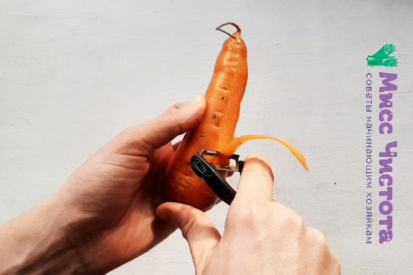 - Technique de nettoyage. Pour retirer facilement la peau, vous devez faire une coupe longitudinale.Ensuite, la peau est ramassée par le bord et le légume est littéralement « déshabillé » en un seul mouvement. Les grosses carottes sont d'abord coupées en travers (divisées en 2-3 parties).