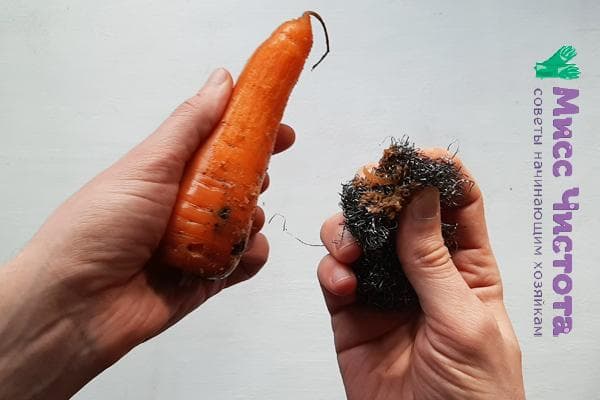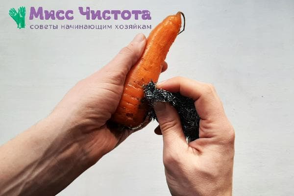 - Nous prenons une éponge de fer dans nos mains et, avec une légère pression, frottons les carottes sous l'eau.