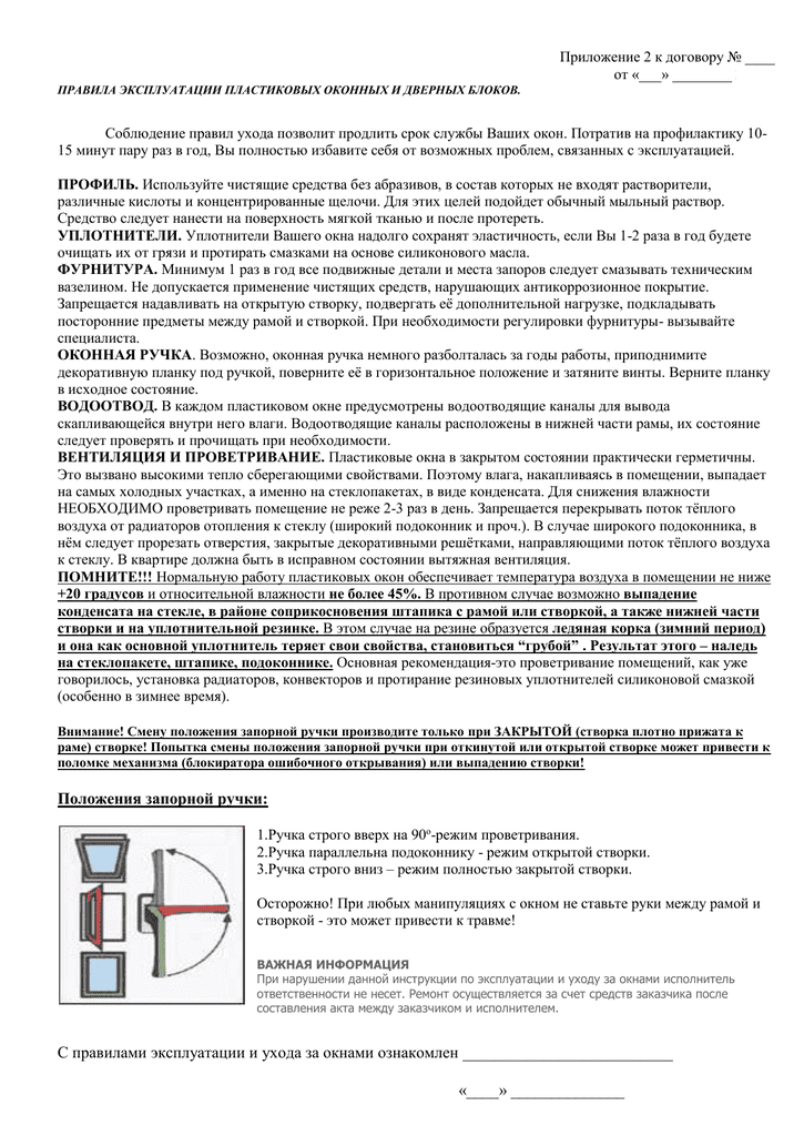 Lors de la conclusion d'un contrat pour l'installation de fenêtres métal-plastique, de nombreuses personnes signent les papiers sans regarder. Et puis ils les mettent dans le tiroir du fond de la table et sont oubliés en toute sécurité (au mieux). Entre-temps, ces documents contiennent des informations précieuses sur l'entretien approprié de la structure de la fenêtre et de ses différents éléments :