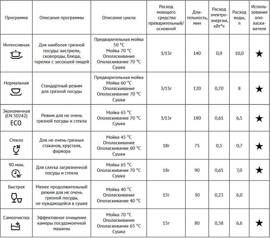 Le programme est conçu pour laver la vaisselle moyennement sale. Pendant le cycle, une quantité minimale d’eau et d’électricité est utilisée. Le mode économie permet d'économiser considérablement de l'argent – 20 %. Mais pas le moment. Le lavage ECO dure plus de 3 heures.