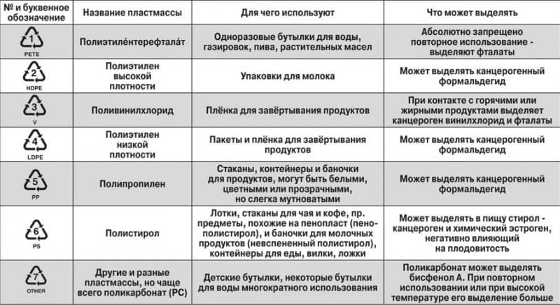 S'il n'y a pas de marquage de ce type, faites attention à l'icône en forme de triangle formé de trois flèches. Il y a un numéro à l'intérieur qui indique le type de plastique. Il montrera l'adéquation du récipient pour conserver les aliments et les laver en PMM :
