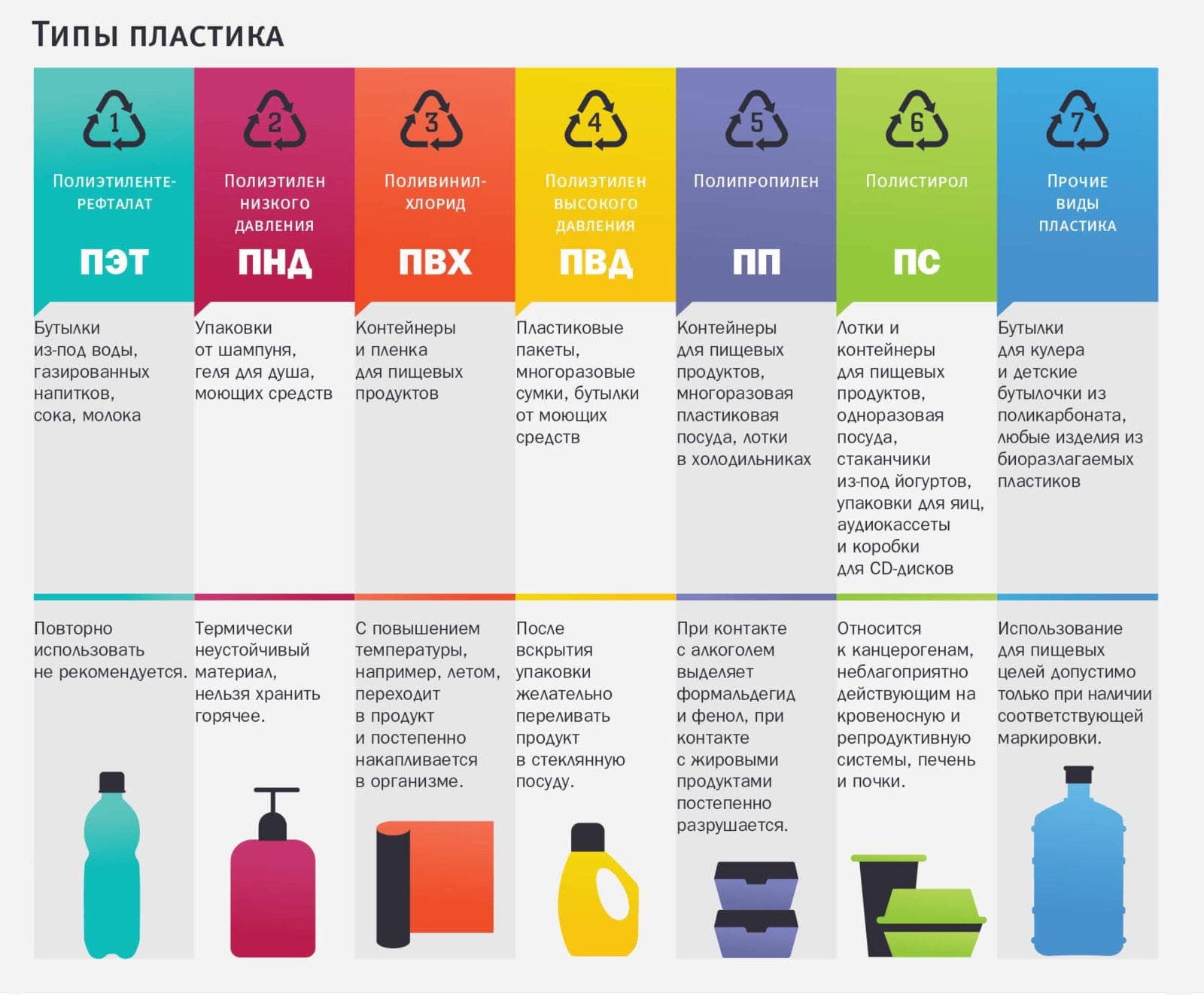 Il existe 7 types de plastiques au total. Un étiquetage unifié a été adopté il y a 30 ans. Les icônes sont imprimées sur les produits en plastique - un triangle avec un numéro correspondant au type de matériau. De plus, sous le symbole se trouve généralement un code alphabétique.