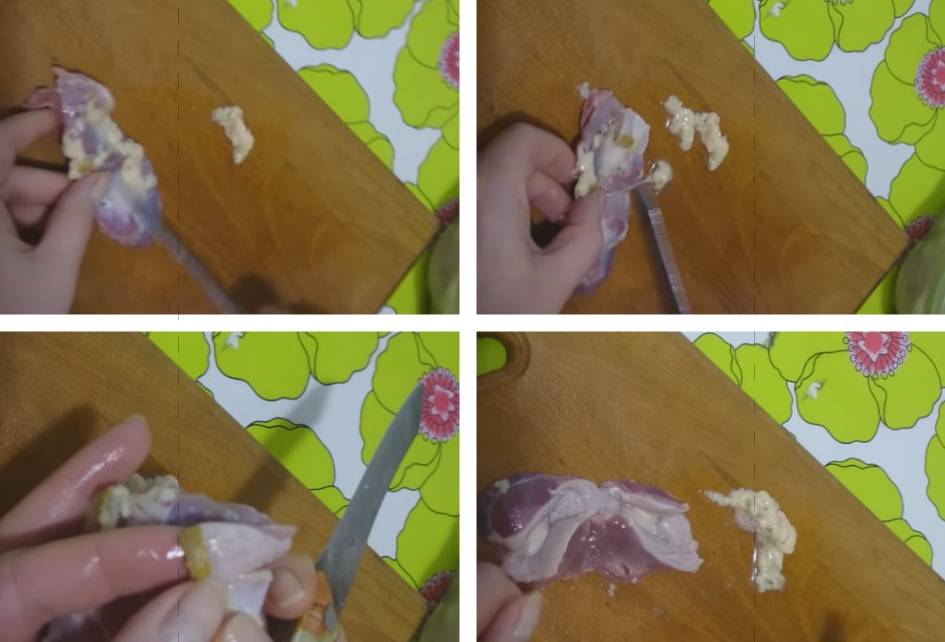 - Ensuite, nous retirons le film jaune tapissant la surface de l’organe de la surface interne du ventricule. Si vous ne nettoyez pas ce tissu adipeux, le plat ne deviendra pas mou et ces formations ne pourront pas être mâchées.