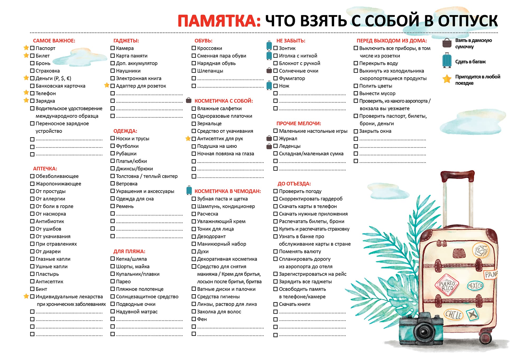 - Faites à l’avance une liste de ce que vous devez emporter avec vous. Relisez-le plusieurs fois - vous trouverez certainement quelque chose d'inutile ou de manquant. Peut-être que certains éléments peuvent être remplacés par des analogues plus petits.